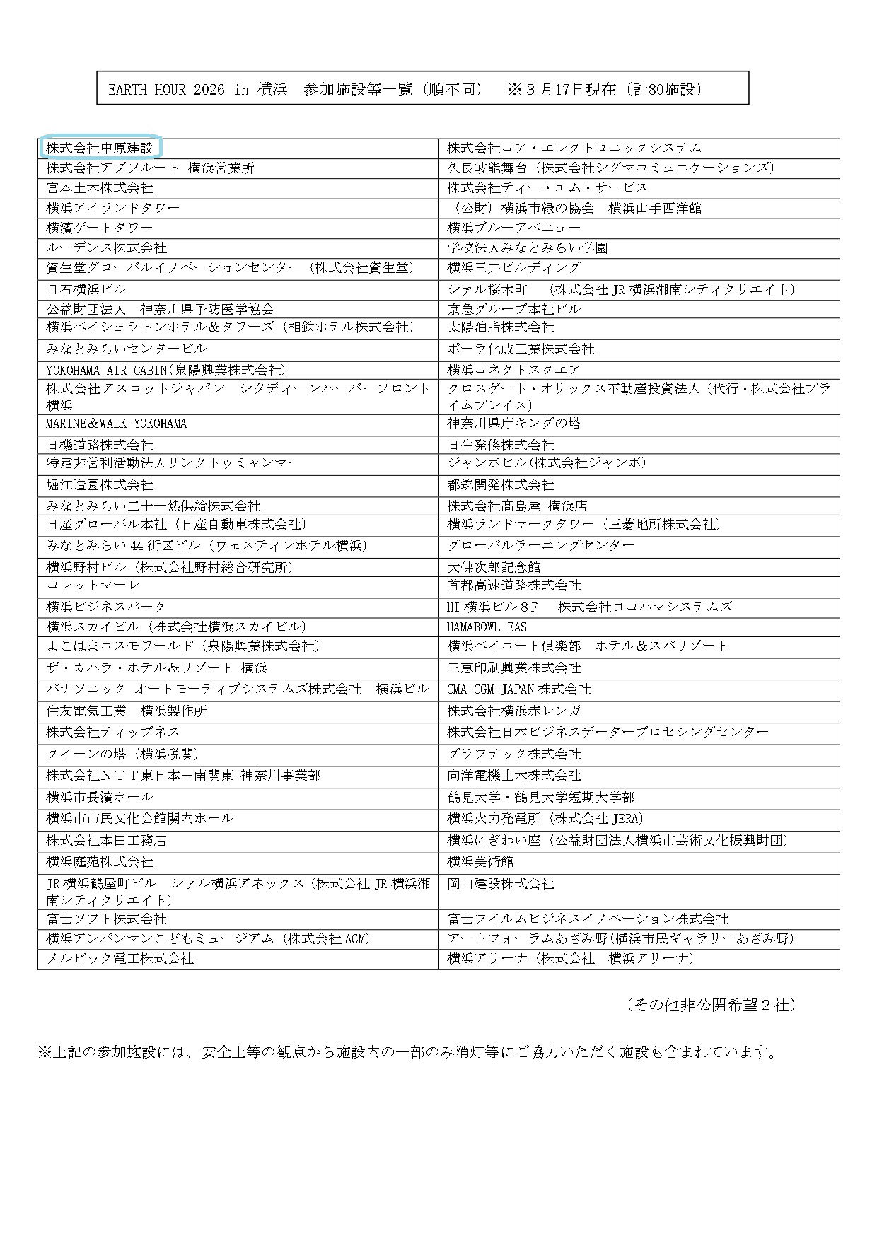 EARTH HOUR 2022 in 横浜 参加施設等一覧(順不同)